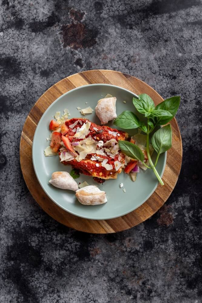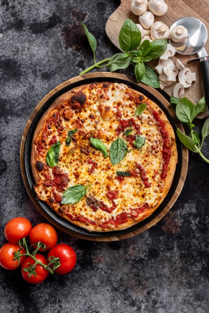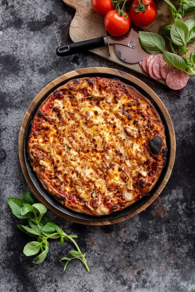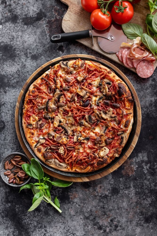 Italian tomato, vegan cheese, potato, capsicum, pineapple, garlic, mushroom