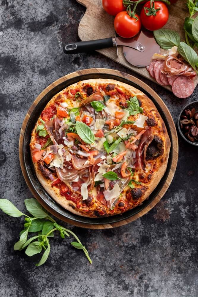 Italian tomato, mozzarella topped with prosciutto, rocket & shaved parmesan