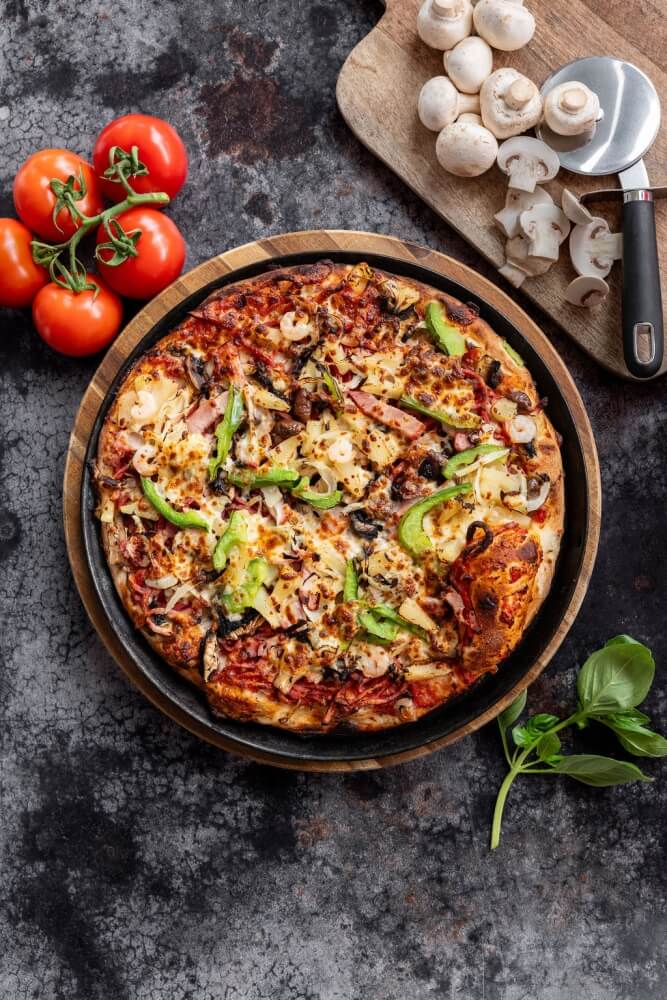 Italian tomato, mozzarella, mushrooms, pepperoni, pineapple, onions, ham, capsicum, olives & prawns