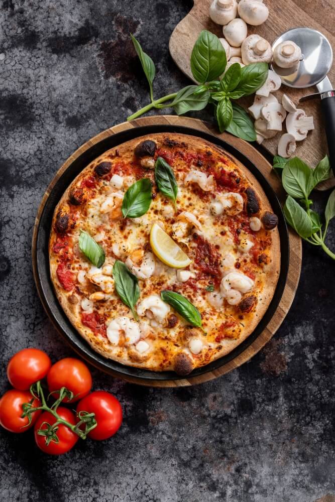 Italian tomato, mozzarella, large prawns, salmon scallops, garlic & fresh basil