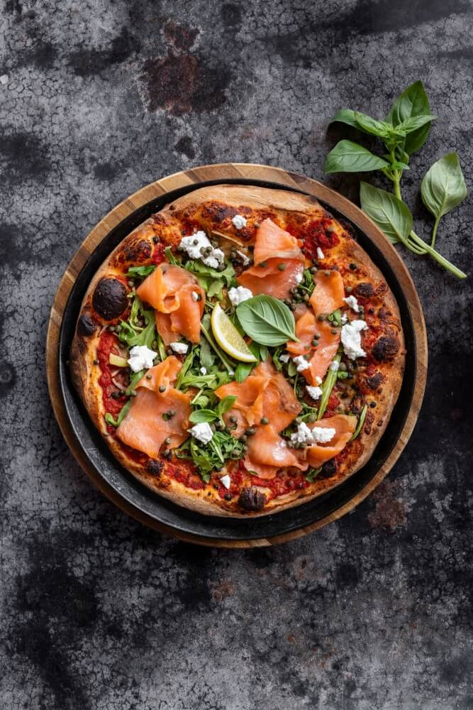 Cheese, onion, smoked salmon drizzled with olive oil, mascarpone cheese & capers