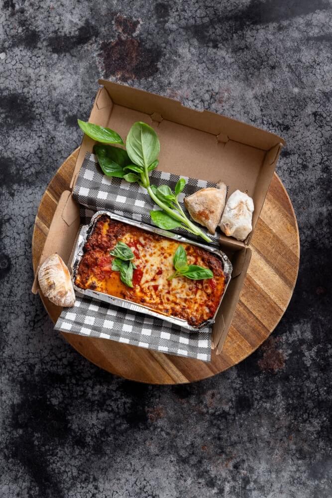 Lasagna, choice of cake, soft drink can